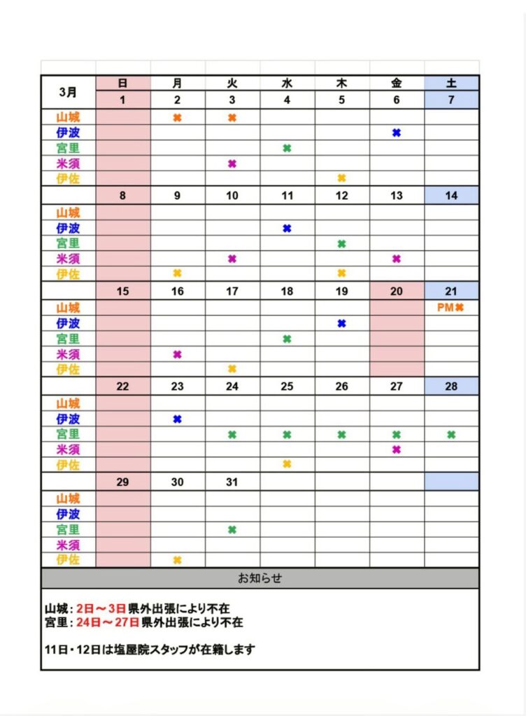 赤道本院3月の営業日・スタッフスケジュールのお知らせ