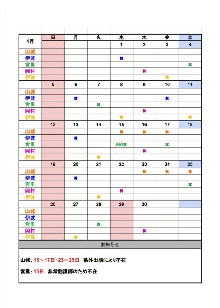 🗓️ 4月の営業・スタッフスケジュール